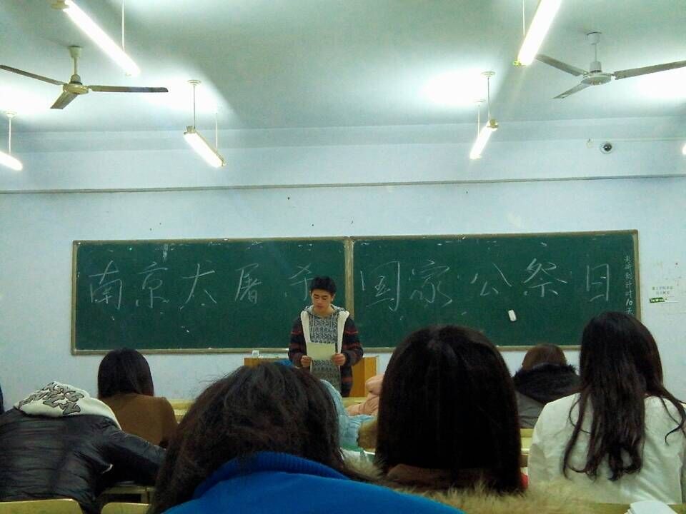 历史永不忘却。把这一天,12月13日定做公祭日,意在激发广大青年的爱国热情,告诉中国人民要铭记历史,勿忘国耻,正视历史,展望未来,努力奋斗。通过主题班会,在默哀的一分钟里,同学们认真回顾我们惨痛的历史,表达哀思。想一想那血流成河的南京,想一想那些破灭的家庭,想一想他们残暴的行径,想一想那些无辜的死难者……我们要和平。在那段腥风血雨的日子里,我们的同胞守望相助、相互支持,众多国际友人也冒着风险,以各种方式保护南京民众。我们也心存感动。