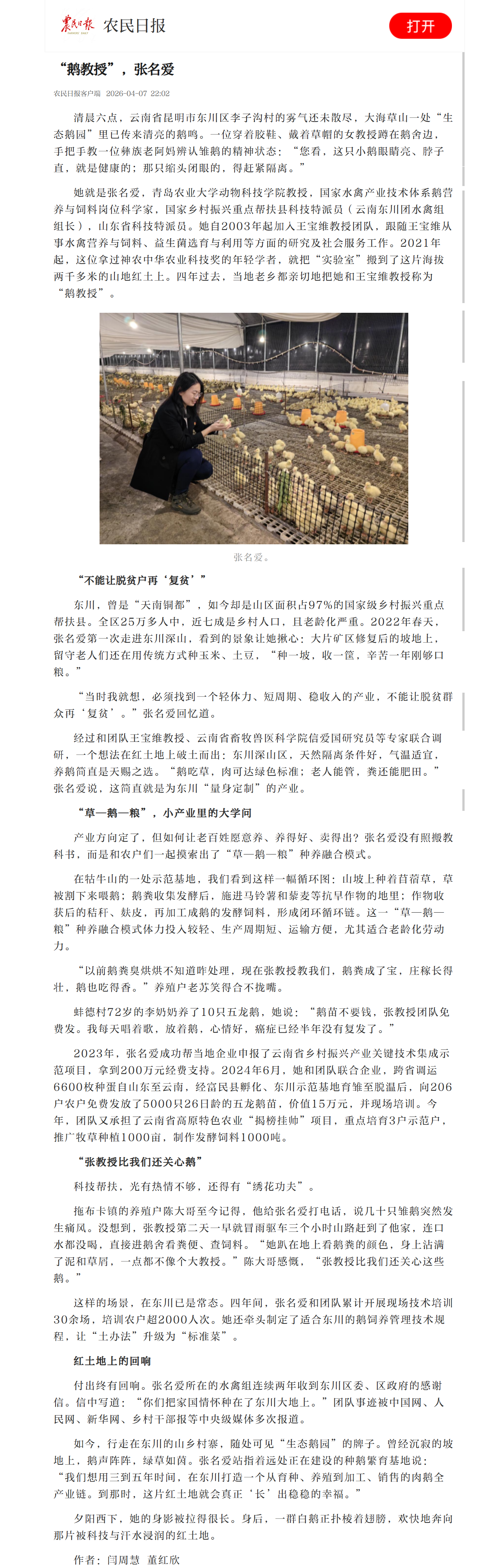 她就是张名爱,青岛农业大学动物科技学院教授,国家水禽产业技术体系鹅营养与饲料岗位科学家,国家乡村振兴重点帮扶县科技特派员(云南东川团水禽组组长),山东省科技特派员。她自2003年起加入王宝维教授团队,跟随王宝维从事水禽营养与饲料、益生菌选育与利用等方面的研究及社会服务工作。2021年起,这位拿过神农中华农业科技奖的年轻学者,就把“实验室”搬到了这片海拔两千多米的山地红土上。四年过去,当地老乡都亲切地把她和王宝维教授称为“鹅教授”。