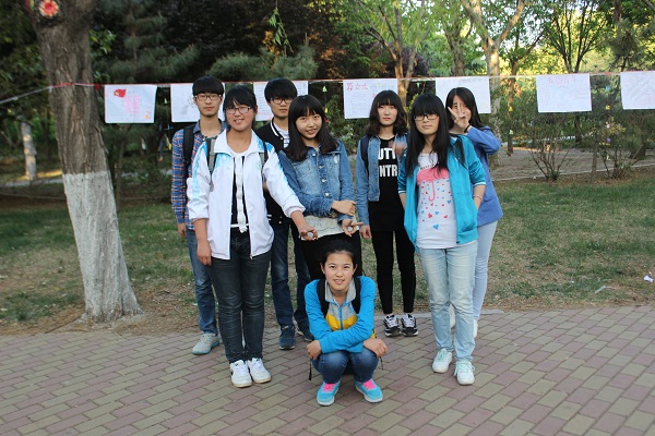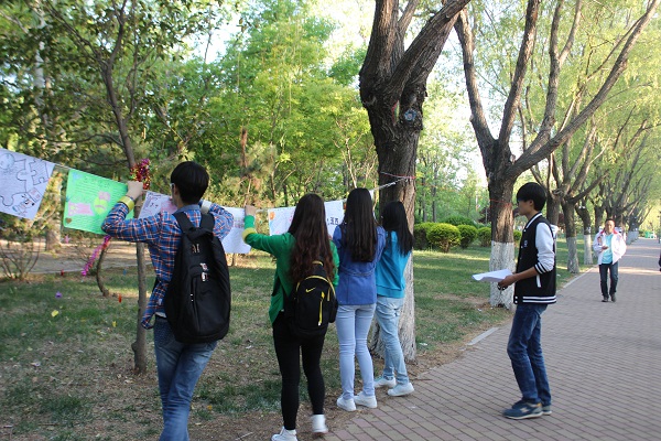 5月4日下午,动科心理发展部成员将征集到的作品进行整理,并挑选出其中的优秀作品,在润兴餐厅前的路边展出。动科学院心理发展部成员聚集在此,进行展出工作的准备。他们分为两组,一组负责叠纸鹤,并用线穿起来;另一组负责在路边的树之间绑上绳子,并将手抄报挂在绳子上。两组成员各司其职、默契配合,很快完成了工作,将优秀作品悉数挂在了路边。作品刚挂上去,便吸引了路过的同学,大家纷纷上前观看,不时点评一下这些作品。