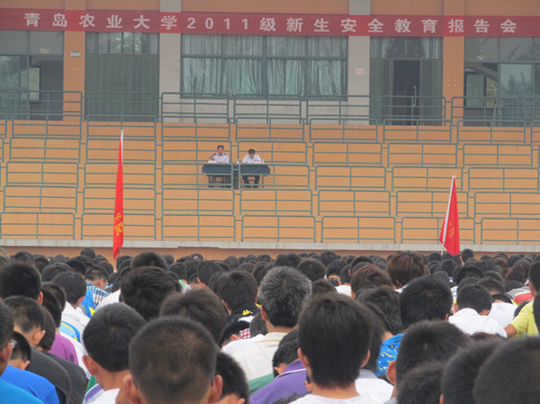 9月7日下午,为了提高2011级新生的校园安全意识,青岛农业大学在五环体育场召开新生安全教育报告大会,2011级全体新生参加了会议。