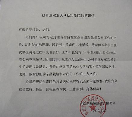 近日,学院收到南京龙生源商贸有限公司发来的感谢信,对我院学生在实习中的表现表示了肯定,对学院及学校的工作表示感谢。为让学生积极投入社会实践,加强理论与社会实践相结合,积极促进就业,2010年寒假期间,学院组织部分学生到公司进行实习。