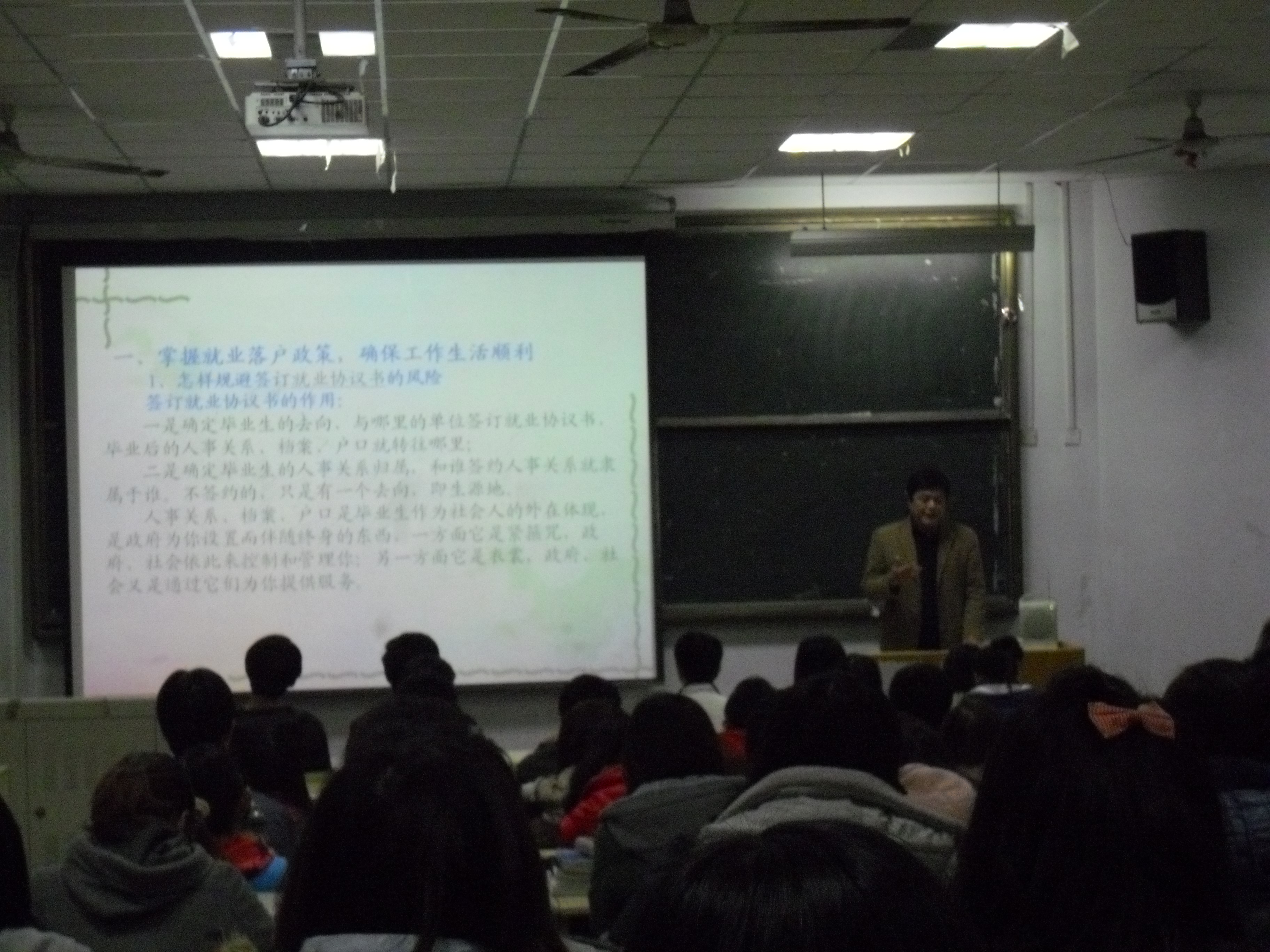 于经理就大学生就业、劳动保障以及人事政策法规等专门做了详细的介绍。主要向大家说明了签订就业协议书应注意的问题,报道落户及人事关系转移问题,档案与户口问题,人事代理问题,劳动法及劳动合同法的相关内容以及社会保险等问题。并着重强调了要掌握好就业落户的政策,善用人事代理,劳动政策法规,以确保同学们工作生活的顺利,为职业生活的发展创造条件,保驾护航。