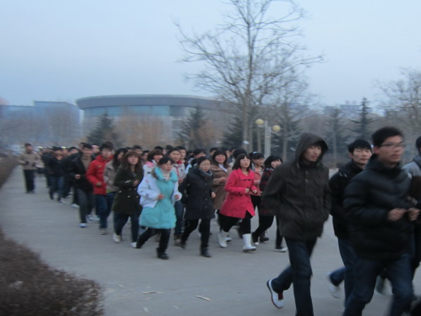 早晨6:30,全体学生在主楼后集合完毕,在各班体育委员的带领下,口号嘹亮,铿锵有力。同学们在寒假过后依旧严格要求自己,队伍井然有序,步伐一致,在新学期展现出动科学子崭新的精神面貌,成为了校园清晨一道亮丽的风景线。