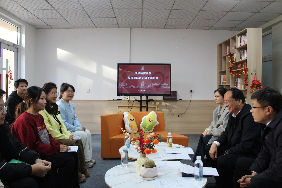 12月5日,动物科技学院于东苑11号楼“一站式”学生社区召开校领导联系班级主题班会。校党委委员、统战部部长赵龙刚出席会议,与所联系的动科公费农科生D2201班学生代表进行了座谈交流。会议由学院党委副书记、副院长辛丽轲主持。