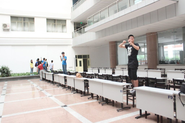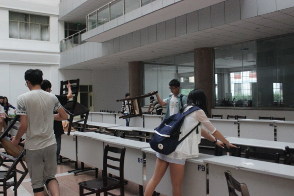 为了使招聘会更好的进行,同学们不惜牺牲空闲时间,积极投身到准备工作中。在本次的会前准备工作中,校企合作部的同学进行监督指挥,14级的男同学负责从其他教学区将桌椅搬进文经楼大厅,而女同学则负责将搬来的桌椅摆正,学生会生活部成员则将展览用的钢线固定好。男女同学们合作默契,准备工作进行的井然有序,原本空旷的大厅很快就被整齐的桌椅填充。最后,女同学们将桌椅擦干净后,陆续离开。