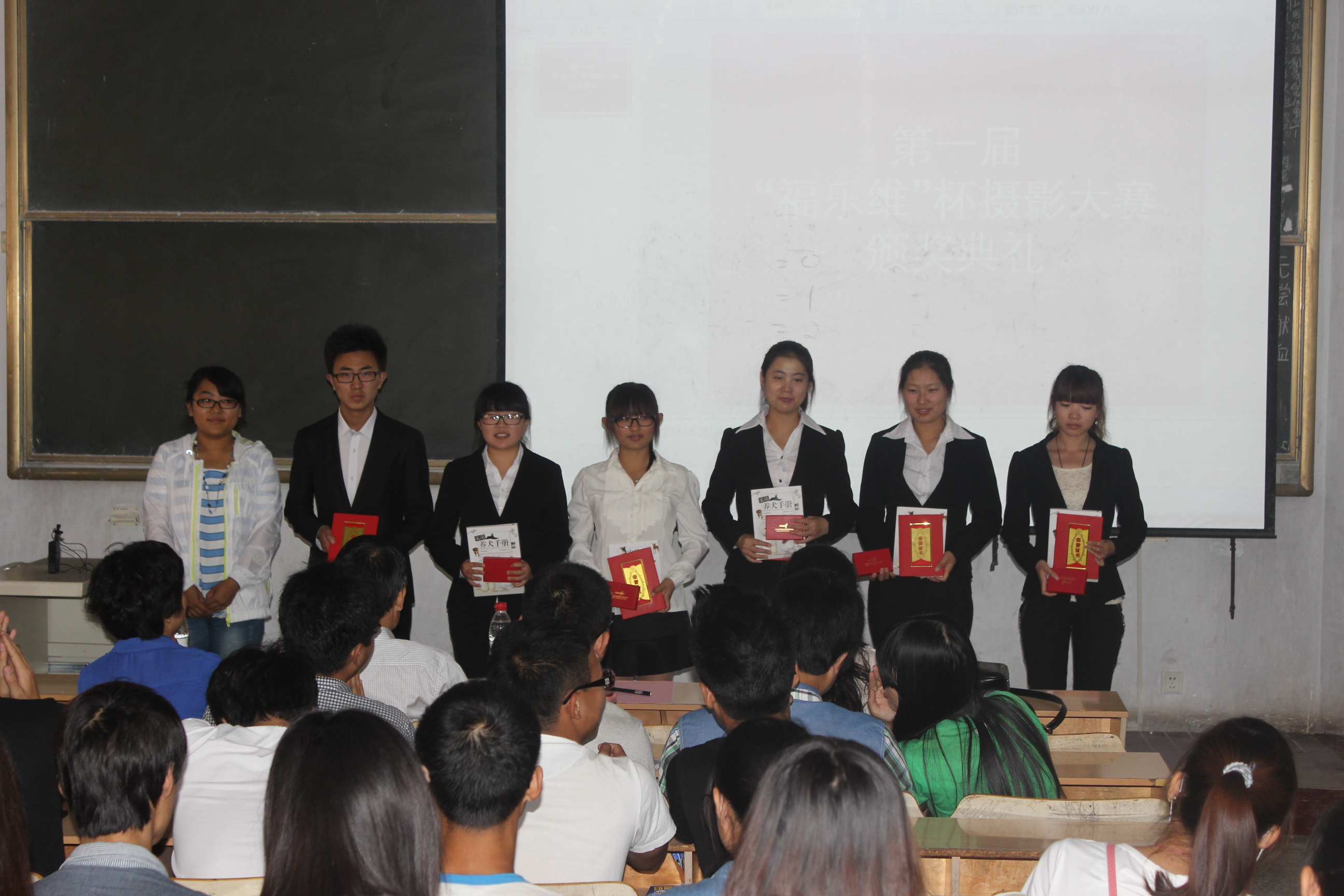 颁奖典礼开始先向现场观众播放获奖照片精彩剪辑视频。在欣赏完照片剪辑视频后,来光明先生、薛华伟女士分别给获得特等奖、一等奖的同学颁发奖品。两位老师分别给获得二、三等奖的同学颁发奖品。在颁发完奖品后,薛华伟女士借此次颁奖典礼的机会进行企业介说,向动科学子简明地介绍了福乐维公司现阶段的发展形势,同时又对此次摄影大赛的成功举办表示祝贺。来光明先生又对在场的动科学子进行职业规划培训,向同学们对各种职业规划做了介绍,给同学们带来一笔宝贵的财富。