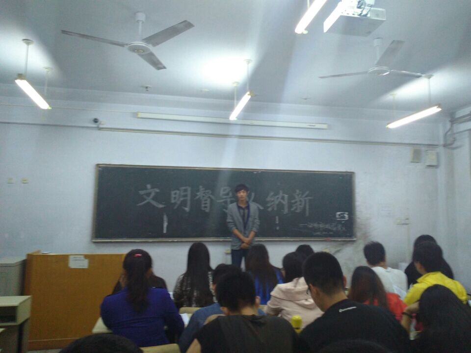 10月12日下午6点30,动物科技学院文明督导队在教学区A204举行了纳新面试活动。活动由纪检部干事王妍主持,出席本次活动并担任评委的有学生会主席团成员,学生会各部门部长以及纪检部全体干事。