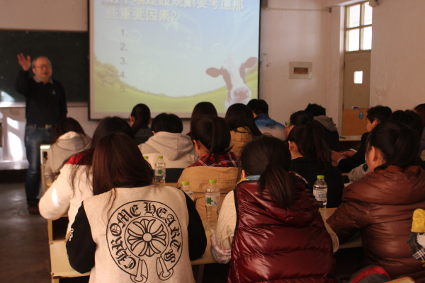 课堂伊始,陈总先是通过一个简单的PPT谈到同学们做人应该像一只鹰一样去解决问题,而不是像鸭子一样只会去抱怨问题。随后,他从奶牛场建设规划要考虑的重要因素入手,一步一步地引导同学们去思考在奶牛牧场中应该注意到的问题和需要准备的东西,给同学们普及了许多关于奶牛场建设需要的知识,不同奶牛的市场价格、奶牛的饲料比例及不同规模的养殖场的投资建设金额,这些都是在课本上学不到的。除此之外,陈总还为同学们讲解了一组关于大型养殖场的幻灯片,使同学们更为深入的了解了关于养殖场的内部构造和运作系统。
