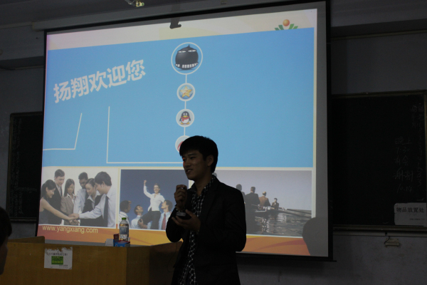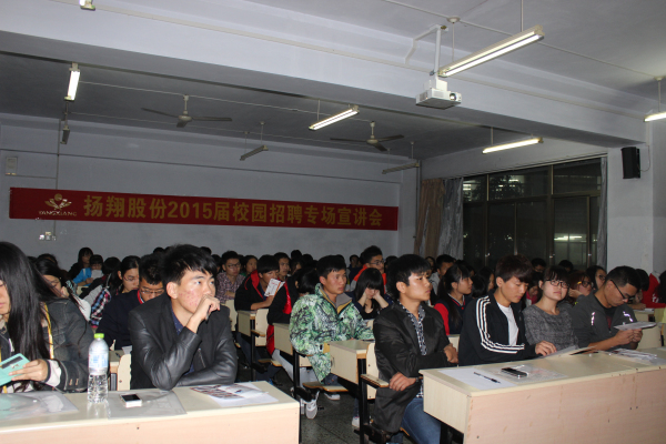 路经理首先介绍了公司特色的“一家人”的企业文化,接下来,她从公司发展状况、公司福利及薪酬待遇等方面详细介绍了扬翔近年来的发展状况。“作为一个具有远大发展前景的新公司,我们十分重视新人的发展,只要你肯努力,在扬翔一定会得到你想要的。”路经理着重强调。互动环节,同学们根据自身特点提出了自己的疑问,路经理均给予耐心细致的解答。