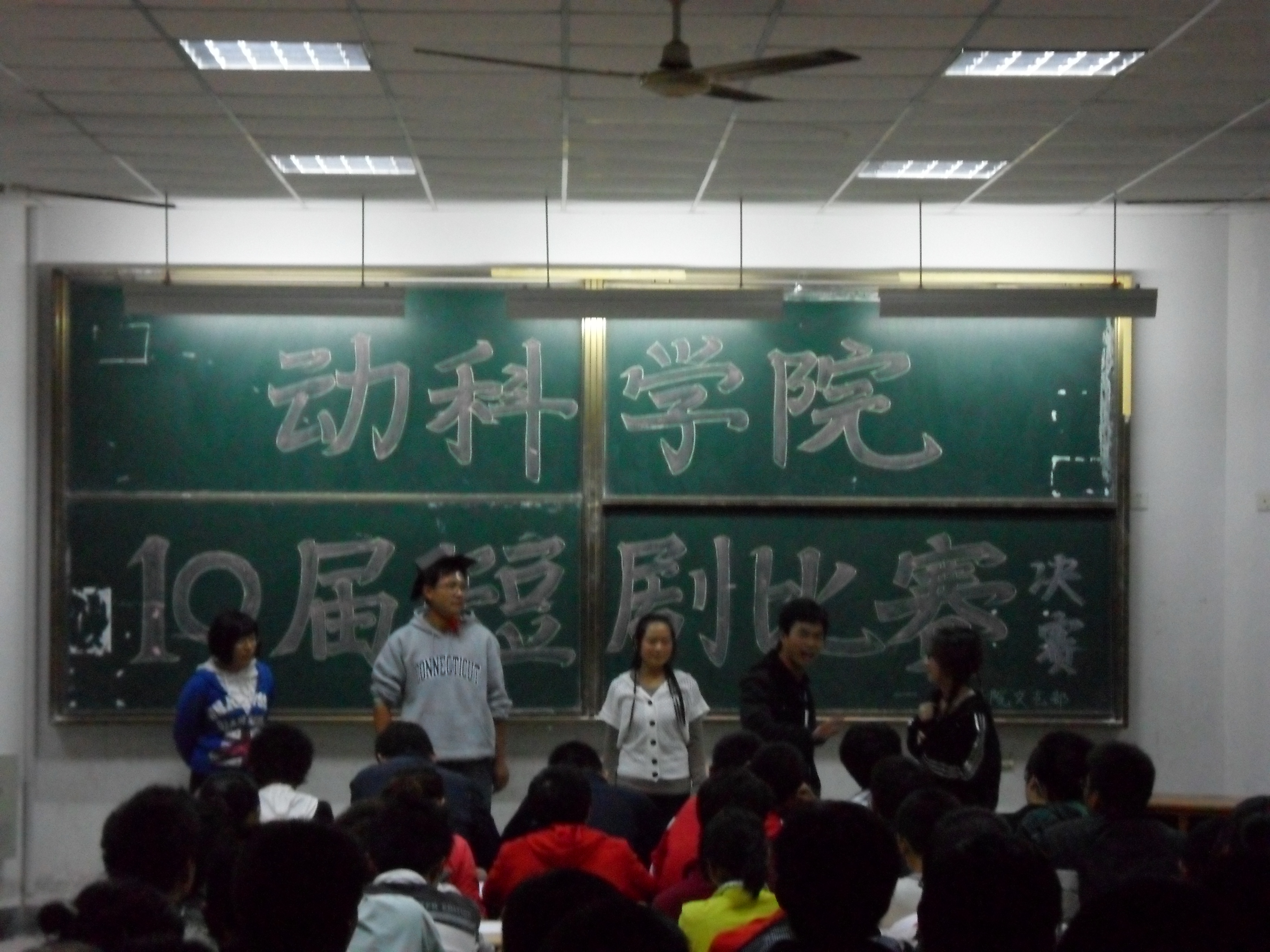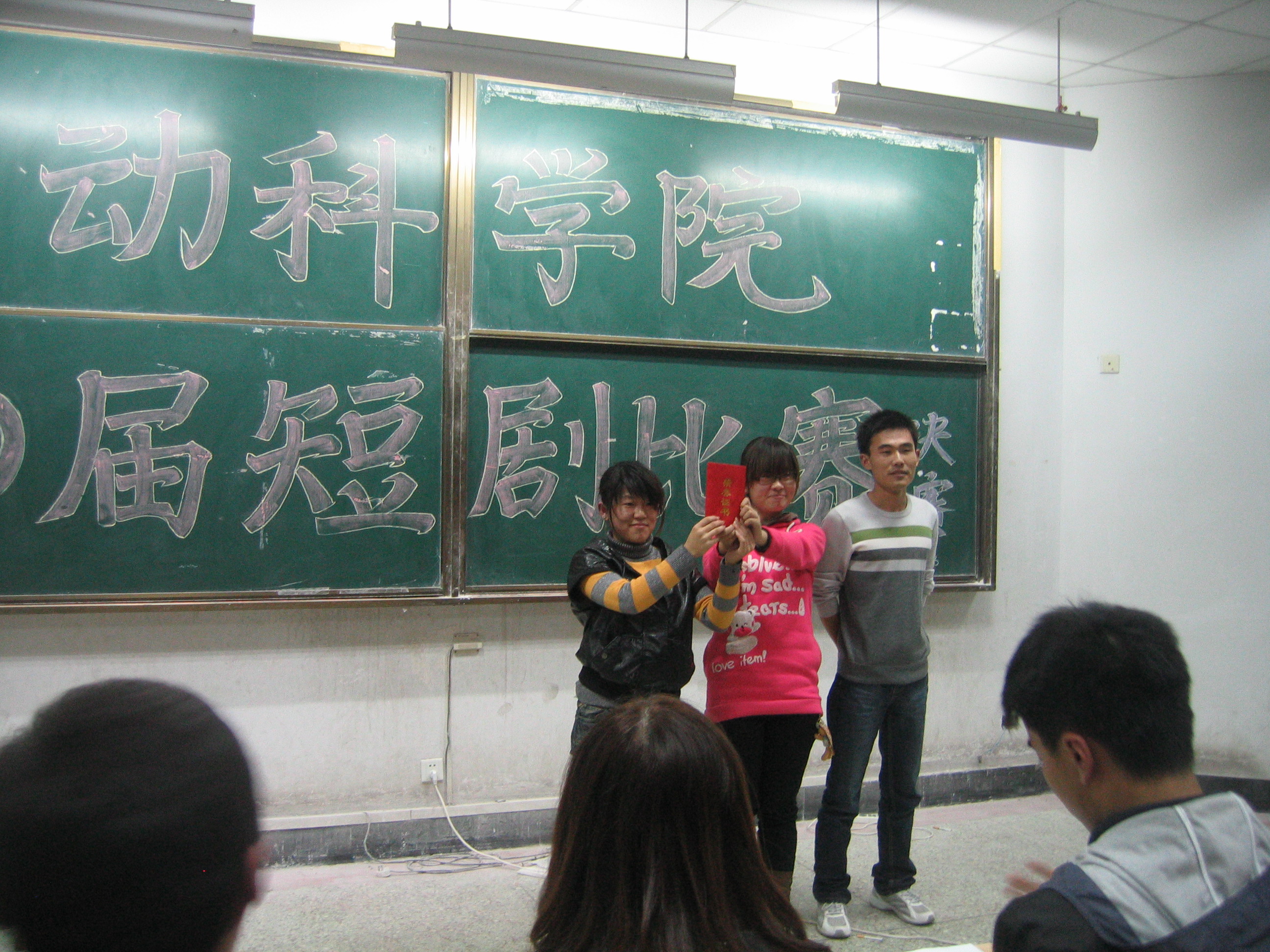 为丰富校园文化生活,展现当代大学生朝气蓬勃、积极向上的风貌。10月23日,动物科技学院学生会文艺部在D301举办了校园短剧决赛。最终09动科一班、四班组合剧组荣获比赛一等奖。