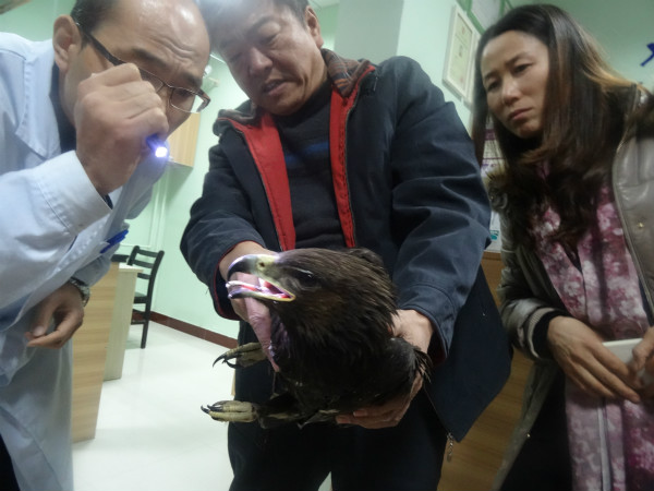 正在对乌雕进行初步的检查,检查显示该乌雕瞳孔反射正常,有体温偏低、精神状态不佳、呼吸缓慢等症状。