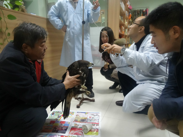 据悉,该中毒的乌雕是上午由青岛市野生动物救助协会志愿者由姜山湿地送到了青岛市野生动物救助协会,乌雕中毒情况严重。协会通过微博联系到了青岛农业大学动科学院从事野生动物教研工作的孙娟教授,在孙教授的联系下,禽类疾病专家张廷荣教授和蓝十字宠物医院杨副教授及动科院的学生们对送来的乌雕进行了及时救治。救治后乌雕的中毒症状得到了暂时缓解,其病情有待于进一步观察。