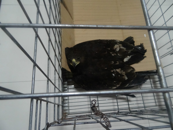 经过一个半小时的紧张救治,乌雕的状态有所好转,在转移到笼子的过程中还挣脱保护站立了起来。