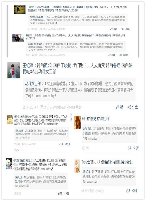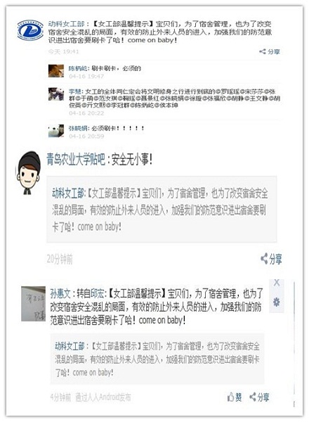 为响应学校关于“厉行节约,文明修身”活动的号召,4月20日,动物科技学院在人人主页上发布关于进出宿舍门刷卡的状态,旨在提醒大家规范自己的文明行为将文明修身之行进行到底。