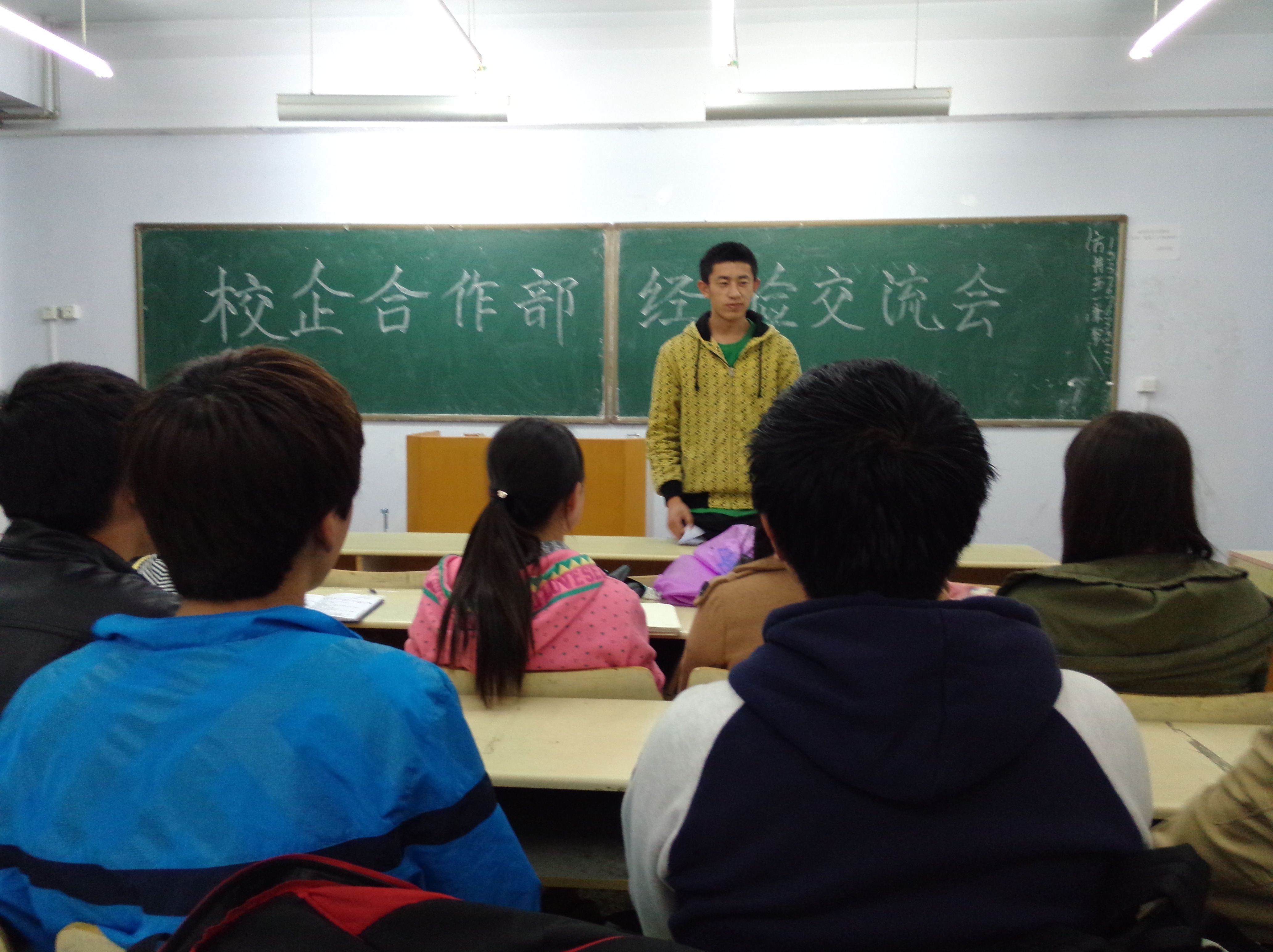 2014年4月27日星期日晚上8:30在教学区A506,动物科技学院学生会校企合作部举办经验交流大会。校企合作部主要干部本着相互提高、互相学习的原则,商讨决定召开经验交流大会。这次会议召开的目的在于加大校企合作部成员之间的协作能力。
