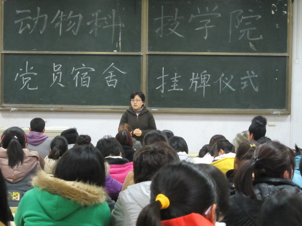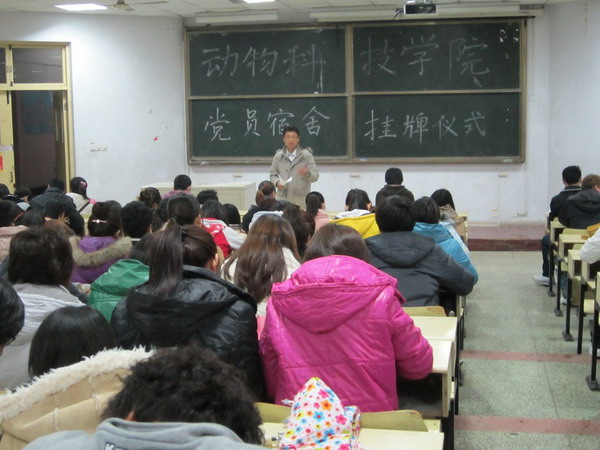 为了充分发挥大学生党员在日常生活中的模范带头作用,建立宿舍文明创建、评比制度, 3月23日下午,动物科技学院在B103举行党员宿舍挂牌仪式。正科级辅导员王海霞、梁伟出席本次挂牌仪式,学院全体生活委员、学生党员和承包宿舍的入党积极分子参加。