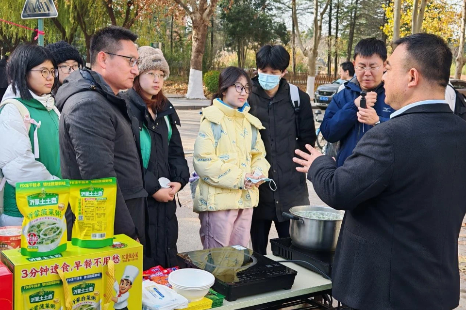 活动现场展销了鹿系列制品、山楂、金银花、煎饼、粘豆包、牛肉酱、糁、果酒等临沂当地具有代表性的农产品。同时,现场制作便捷热食或饮品供师生免费试吃。蒙阴县挂职副县长、动物科技学院教授赵海平现场推介展销产品。现场气氛热烈,前来咨询、试吃、购买的师生络绎不绝。不少师生表示,参展产品生态健康、品质优良,实现了从“田间地头”到“校园餐桌”的高效对接,为乡村振兴贡献了力量。