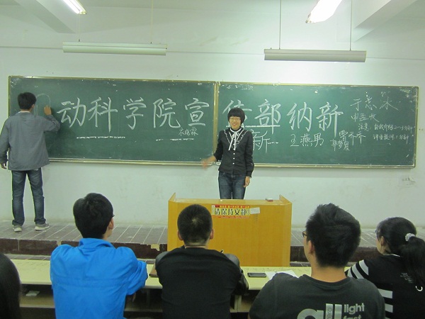 10月9日,动物科技学院在教学区C301举行了学生会宣传部纳新大会。动物科技学院学生会副主席杨震、体育部部长张健、宣传部部长赵玉山以及宣传部各位副部长担任评委,宣传部所有11级干事来到现场,为纳新工作贡献力量,12级新生积极参加。