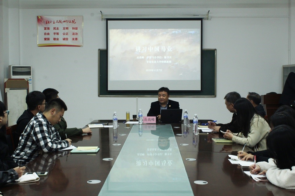11月7日,青岛农业大学动物科技学院草业学院邀请特聘教授、中国马业协会书记、秘书长、马业科学专业高级顾问岳高峰为学院马科专业学生作了题为《讲习中国马业》的报告。山东省马业协会会长、我校马属动物研究院执行院长潘庆杰教授主持报告会,学院党总支副书记、副院长展学斌,马业科学专业负责人李桢副教授出席报告会。