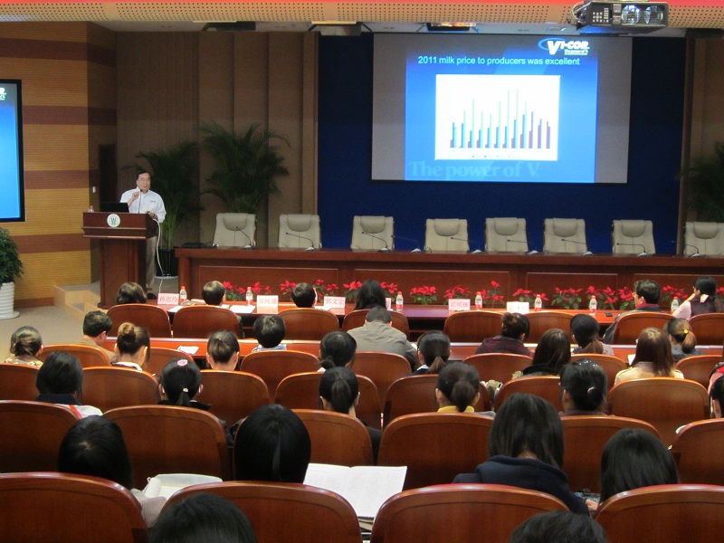 报告会分为两个环节,首先由江明钟博士向同学们介绍了美国奶牛业发展的现状与新技术的应用,分析了正常乳脂、低乳蛋白,低乳脂、高乳蛋白等六种牛奶的质量情况。在新技术应用方面集团采用现代化工艺流程,实行精细化管理,以全面的质量管理体系保障产品质量。之后,俞圣衍总经理向同学们详细介绍台湾奶牛发展的近况,他分别从饲养情况、饲料供应、饲食管理、牛乳品的加工生产和行销五大方面进行了讲解。最后,江博士和俞经理与同学们进行互动,认真解答同学们提出的问题, 充分展现了宜生集团“活力、和谐、一家人”的企业理念。