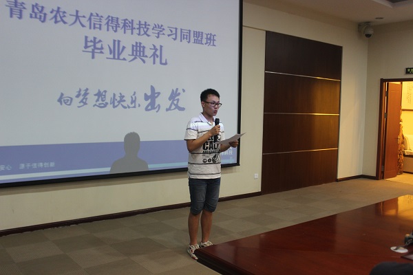 7月3日晚7:00,青岛农业大学信得科技学习同盟班毕业典礼于学术会馆会议厅举办。信得集团董事长李朝阳,动物科技学院分党委副书记、副院长白连万,信得管理学院经理李晓及信得同盟班全体成员参加。典礼由同盟班的班长张奇奇主持。