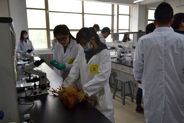 此次比赛的项目是活鸡取血和制作血涂片。本次复赛分为五组,每组七人,比赛根据“采血操作、涂片厚薄均匀、显微操作、白细胞视野以及时间”五个方面计分。