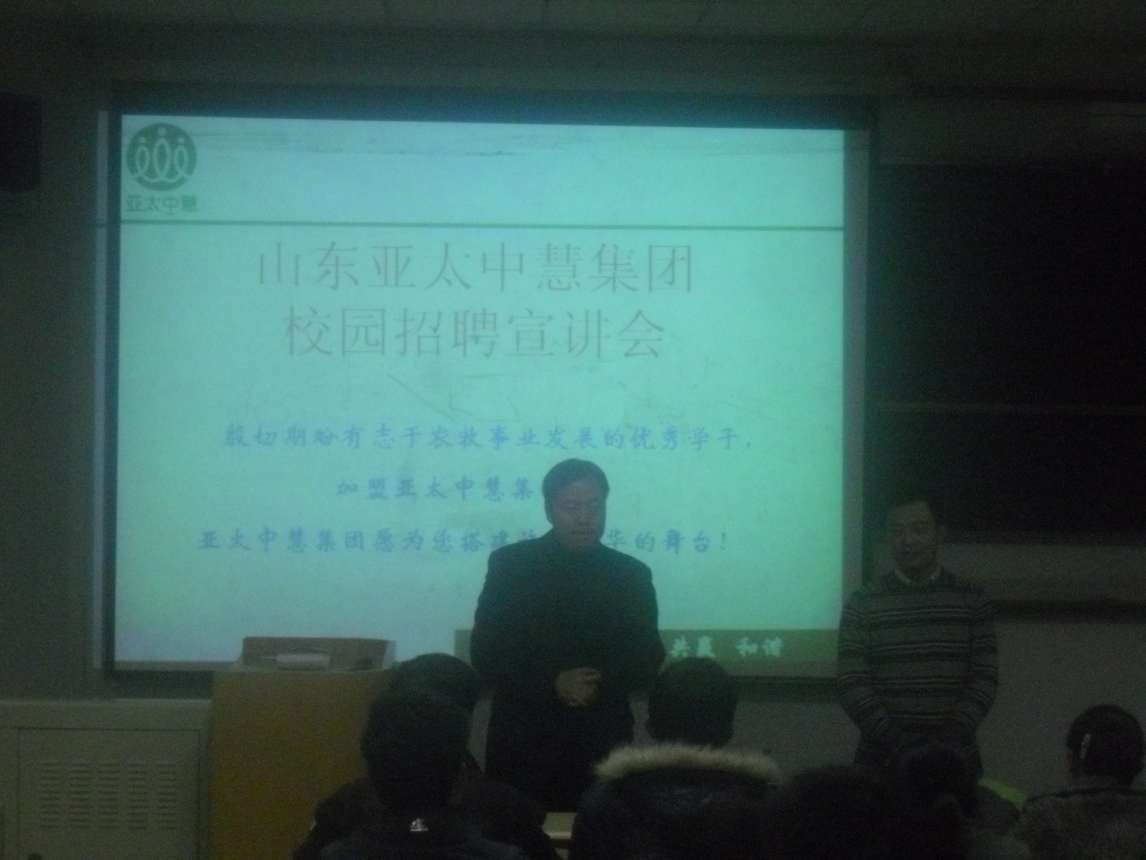 为了能够使同学们更好地了解就业形势,12月9日晚,山东亚太中慧集团人事部潘经理于教学区B202为动物科技学院同学做校园招聘宣讲会。