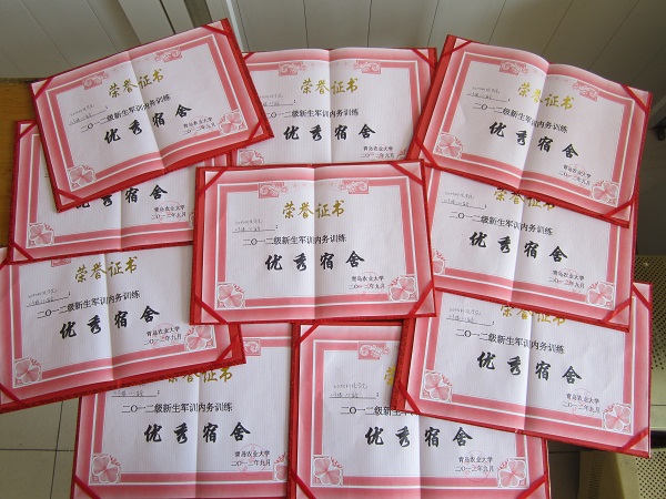 在学院老师、学生会以及11位班助的帮助和12级新生的不懈努力下,动科学院21号楼109宿舍、112宿舍、113宿舍、115宿舍、117宿舍、123宿舍、124宿舍、125宿舍、127宿舍、129宿舍和133宿舍获得校军训内务优秀宿舍称号。