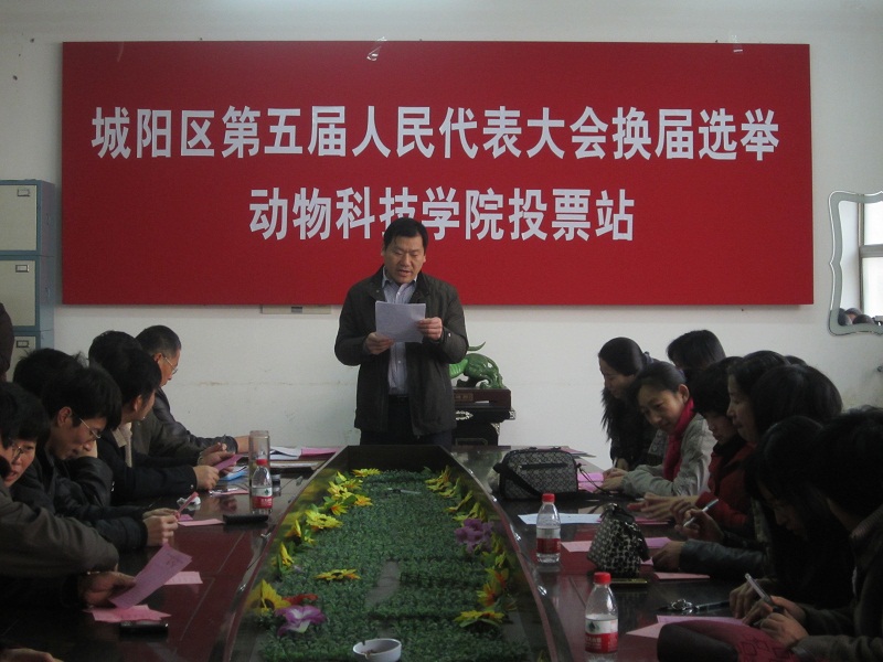 12月19日上午,第五届城阳区人大换届选举投票工作全面展开,青岛农业大学选区动物科技学院投票站在生物楼二楼会议室进行投票选举工作。动科学院院长单虎,副院长潘庆杰,党总支副书记、副院长周顺等105名教职工和241名本专科及研究生参加选举。选举工作由周顺老师主持。