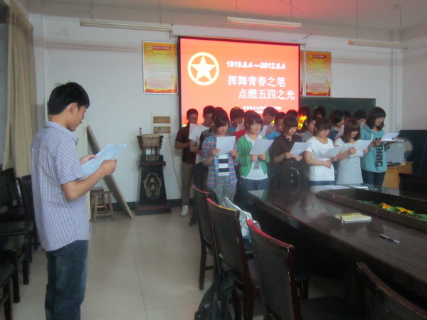 5月4日晚,动物科技学院举办的“挥舞青春之笔,点燃五四之光”青年节朗诵会在生物楼二楼会议室举行,一同纪念五四运动93年周年,建团90周年。活动由动科学院学生会社团外联部王跃主持,学生会各部代表及各协会代表参加了本次活动。