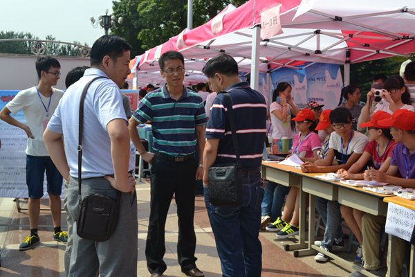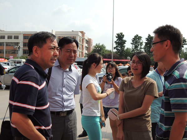 迎接新生第一天,学院领导高度重视,学院分党委书记潘庆杰,分党委副书记、副院长白连万,分团委书记梁伟,辅导员线郁亲临迎新现场,对迎新工作进行指导。