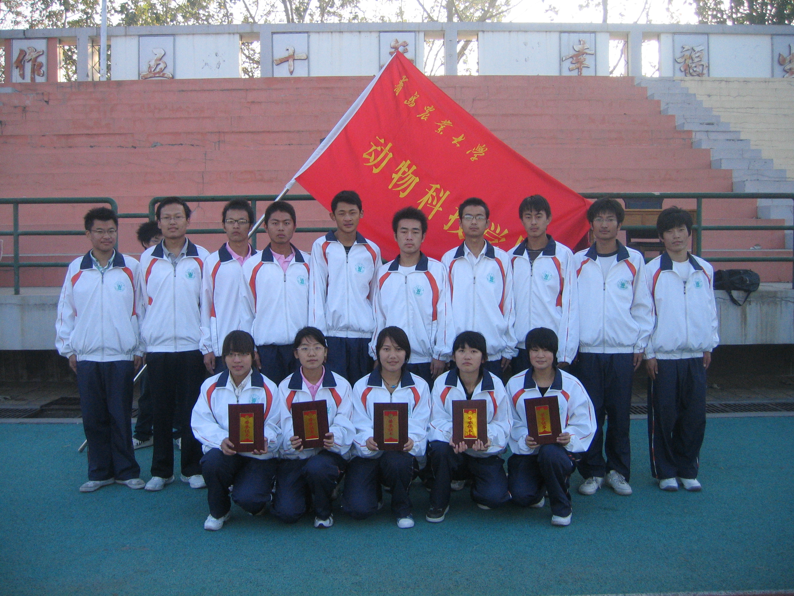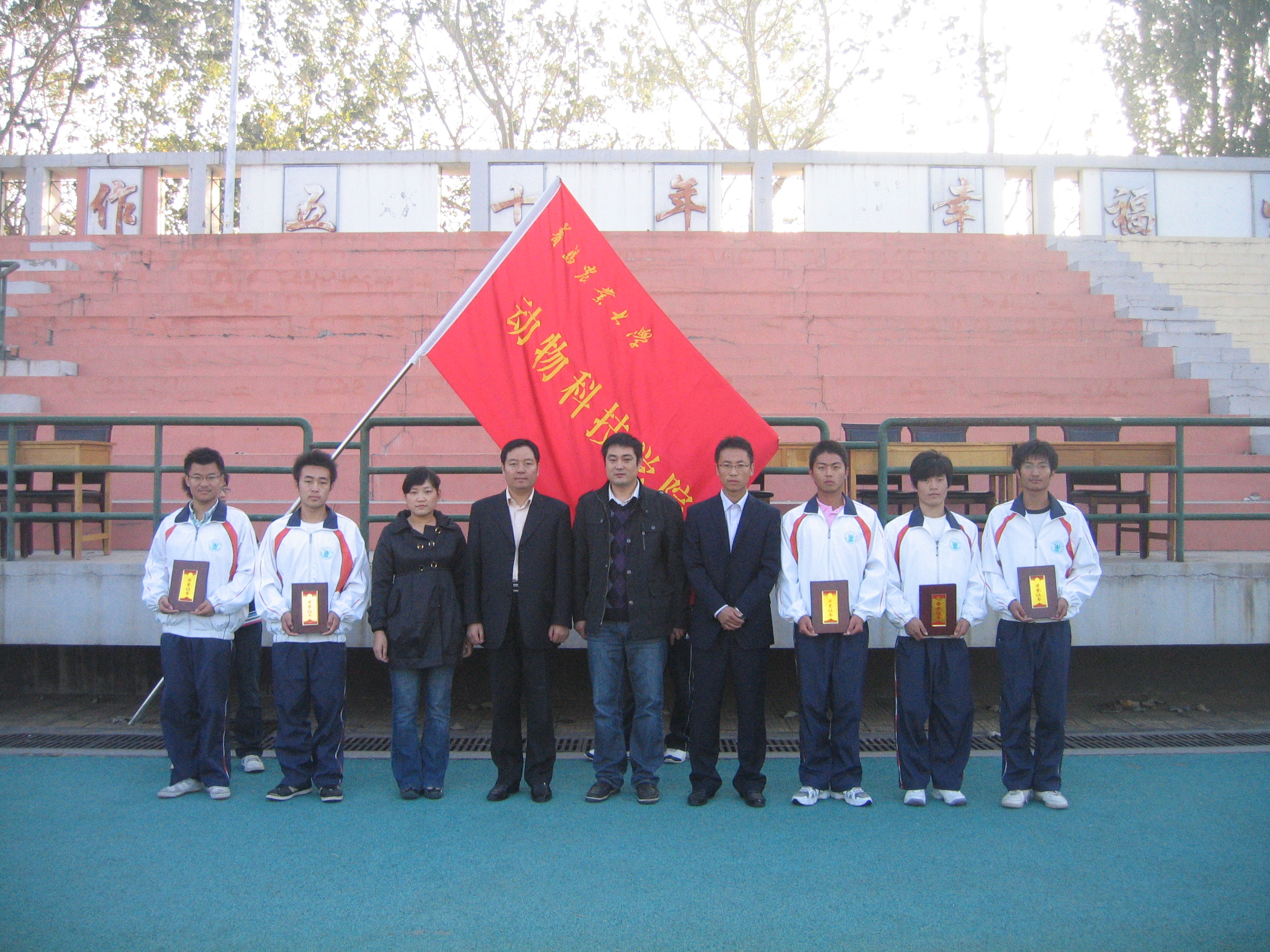 10月23日早晨,动物科技学院在五环体育场举行10级新生队列比赛,学工办全体老师出席比赛仪式,并为获奖班级颁发荣誉证书。