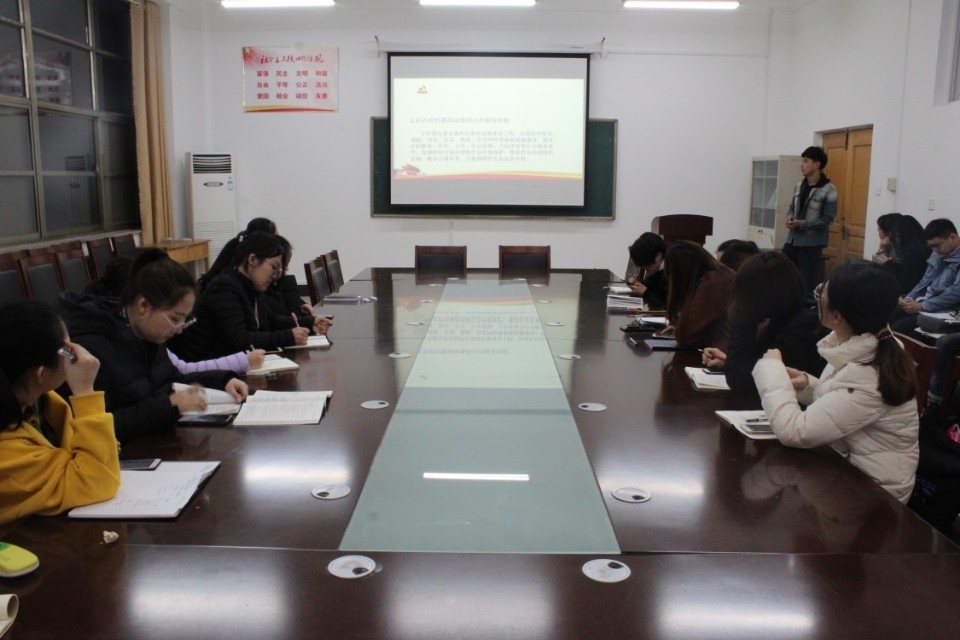 研究生党员张梦瑶围绕普通百姓关心关注的热点问题,通过《2019年政府工作报告—十大热点解读》向全体党员介绍了政府在2019年的工作导向和工作重点。研究生党员高峰通过《2019年中央一号文件—政策解读》向全体党员介绍了中央一号文件的六个突出特点、五项硬任务进行的战略部署以及中央一号文件中与专业相关的内容。