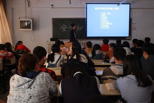 此次宣讲会以安全教育为切入点,从同学们亲身经历的安全隐患讲起,同时播放典型案件的有关视频,深入剖析大学生身边常见的安全隐患,为同学们敲响安全警钟。此次宣讲会上进一步讲解明确了学院有关离返校统计、请销假制度以及离返校乘车安全的要求,并就大学生假期外出游玩的安全问题展开讨论,包括乘车安全、防溺水、防盗等外出需要注意的问题。之后,主讲人为同学们详细列举了一些旅游风景区常见的骗人招数,提醒同学们在玩得开心的同时不要上当受骗。