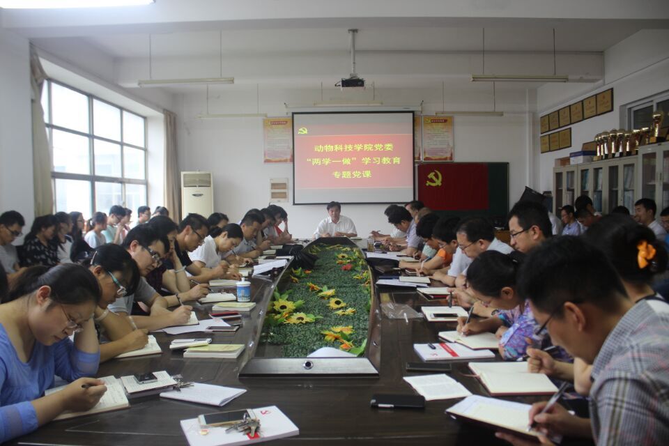 杨同毅给动物科技学院全体党员上“两学一做”学习教育专题党课,动物科技学院党委书记孙运彩主持,全体教工党员及部分学生党员参加学习。