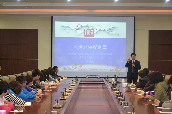 4月13日上午8时30分,山东省牧工商总公司徐春泉总经理为青岛农业大学动物科技学院创业班学生以及有创业想法的同学们开展了第一次创业培训。动科学院院长单虎,分党委副书记、副院长白连万及省内知名企业领导参加了此次活动。