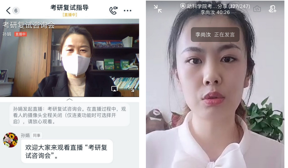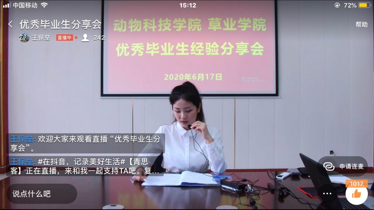 优秀毕业生经验分享会上,进入畜牧行业就业、考取硕士研究生、考取事业单位的优秀毕业生分别结合自己的学习生活经历通过钉钉多群联播和抖音直播的形式与师弟师妹分享了学习经验,优良的学风得到传承和发扬。