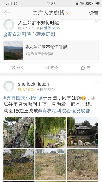 为了给新生提供分享假期生活,展现当代大学生风采的平台,增强学生凝聚力,促进同学之间的沟通与交流,动物科技学院心理发展部于10月9日至11号期间举办了“国庆回忆长,分享乐翻天”国庆微博分享活动。