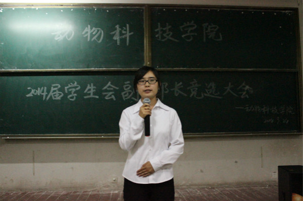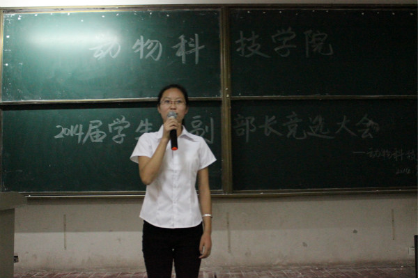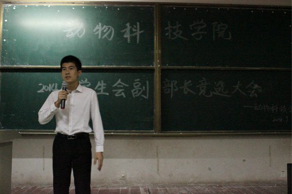 9月24日晚7点,动物科技学院于教学区D304举行学生会换届副部长竞选大会,参与竞选各部副部长的同学分别来自相应部门的2012级与2013级干事,动物科技学院2013届学生会主席林佳生参加并主持会议。