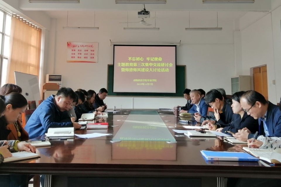 11月7日,青岛农业大学动物科技学院草业学院于学院会议室举办“不忘初心、牢记使命”主题教育第三次集中交流研讨会暨师德师风建设大讨论活动。学校“不忘初心、牢记使命” 主题教育第七指导组成员许大伟列席会议,学院领导和教职工参加会议,研讨会由学院党总支副书记、副院长展学斌主持。