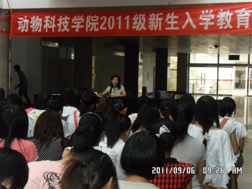 9月6日上午,动物科技学院在生物楼N区大厅召开了2011级新生入学教育专题报告会。动科学院副院长王文琪教授对新生进行了水产专业思想教育。