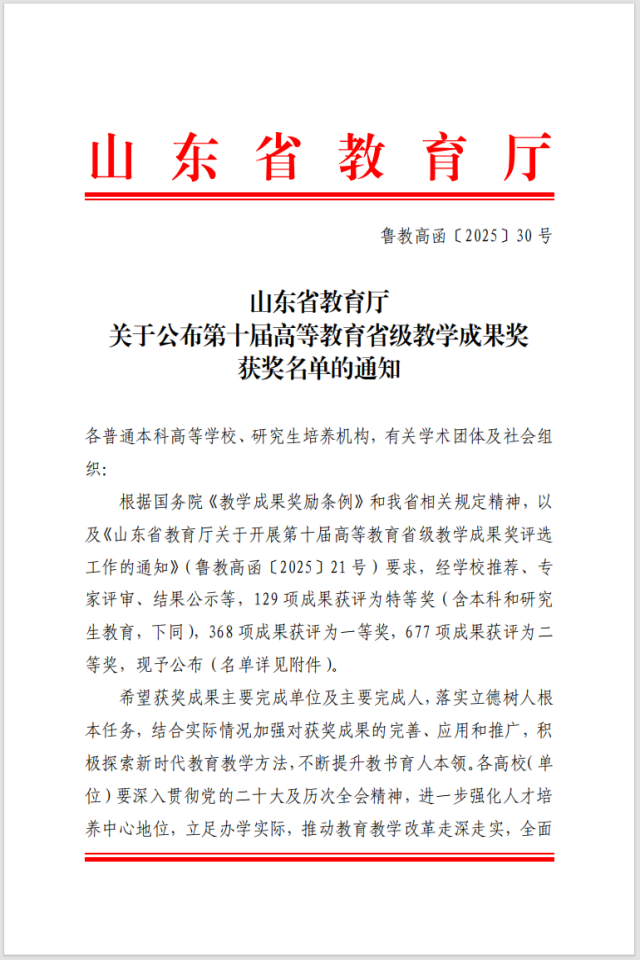 据悉,山东省高等教育省级教学成果奖每四年评选一次,是全省教育教学领域的最高奖项之一,此次获奖,既是对动物科技学院教学改革成果的高度认可,也是对全院教职工辛勤付出的莫大鼓舞。下一步,学院将以此为契机,珍惜荣誉、再接再厉,持续深化教学改革,精进成果凝练与转化,不断提升人才培养质量和教学科研水平。同时,充分发挥获奖成果的示范引领作用,进一步加强产教融合、科教融汇,聚焦畜牧领域人才培养核心需求,为全国畜牧产业高质量发展培育更多优秀人才。