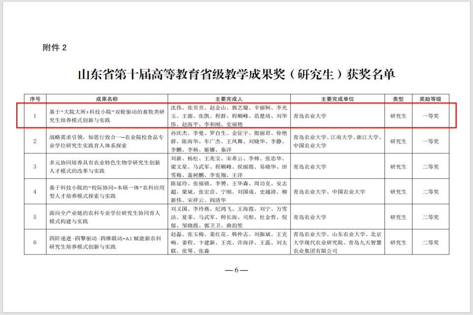近日,山东省教育厅公布了第十届高等教育省级教学成果奖获奖名单,由动物科技学院院长沈伟教授作为第一完成人的教学成果《基于“大院大所+科技小院”双轮驱动的畜牧类研究生培养模式创新与实践》荣获研究生类教学成果一等奖。