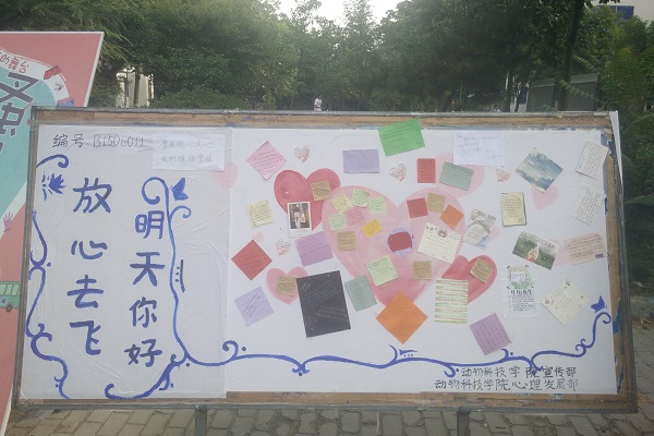 6月9日至6月14日,动物科技学院学生会心理发展部举办为毕业生送祝福主题活动。活动主题为“放心去飞,明天你好。”意在为11级毕业生送上祝福。动物科技学院14级各班参与到其中。